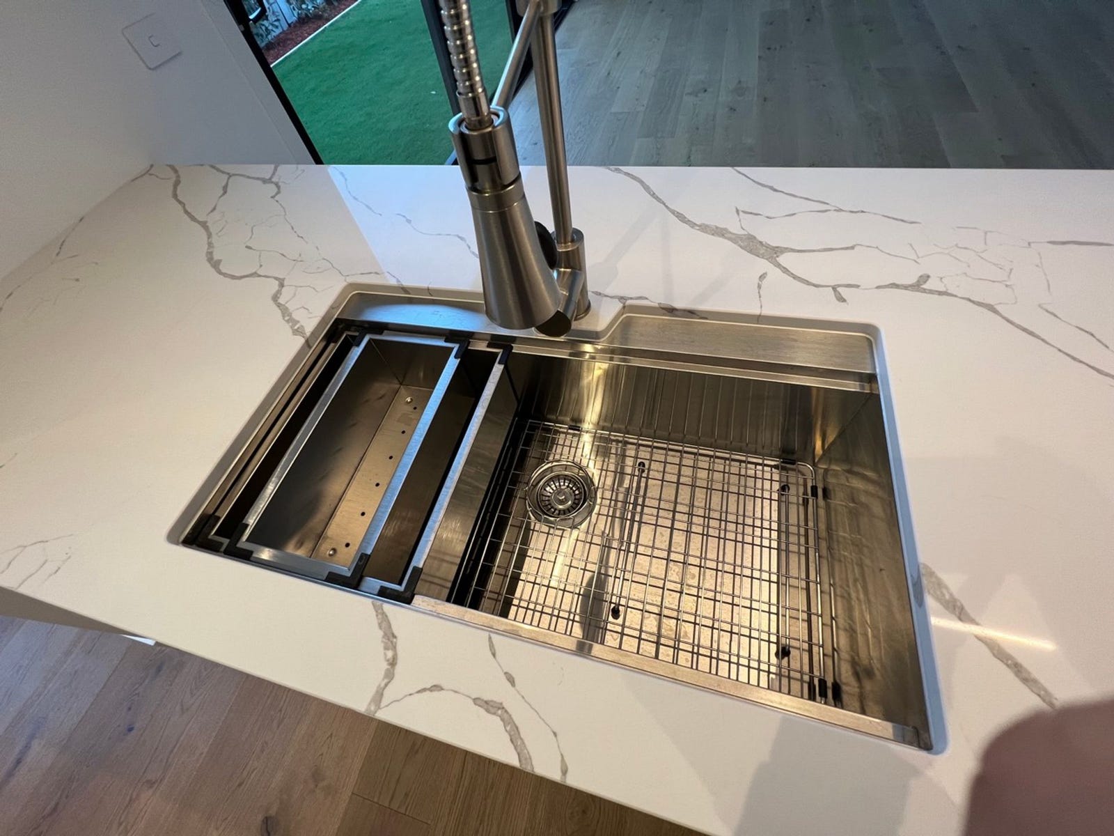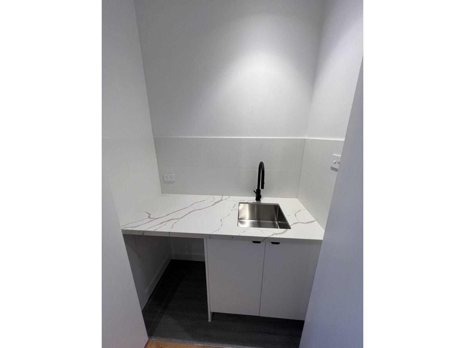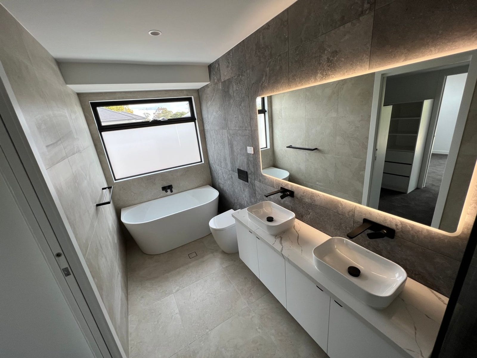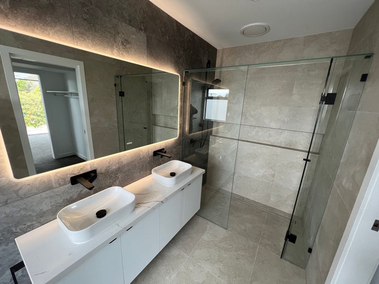 The kitchen is adorned with premium Miele appliances, including an induction cooktop, hood, oven, and dishwasher. Complementing this, a mirror backsplash and engineered kitchen benchtop add sophistication.