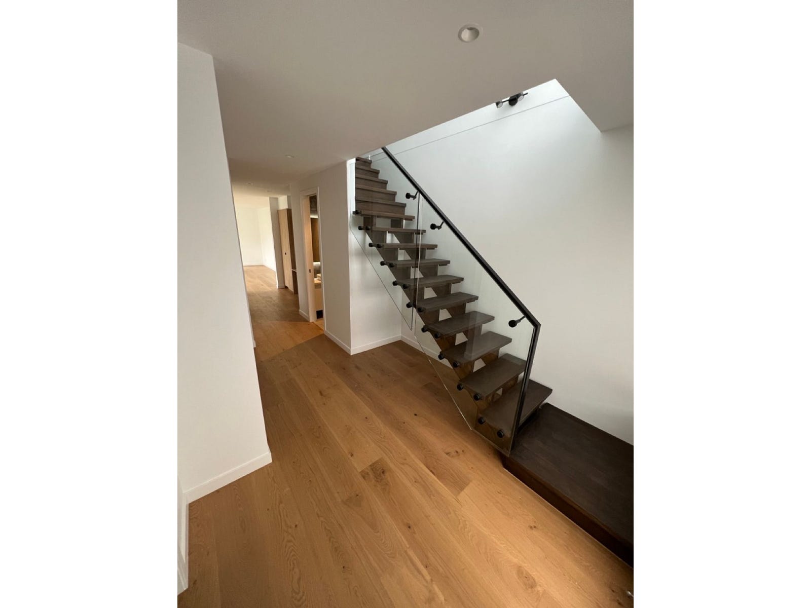 The striking staircase with a glass balustrade, serves as both a functional and aesthetic element, accentuating the beauty of the home.
